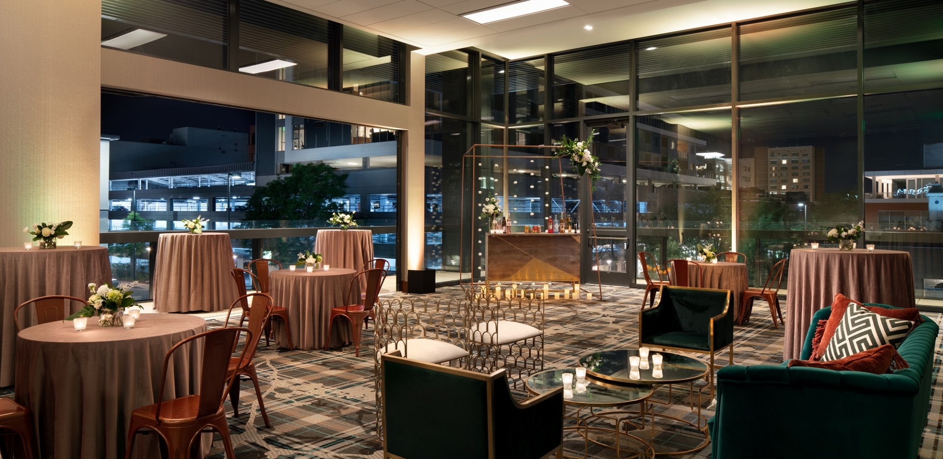 Imagine the photo opportunities of a grand staircase leading from lobby to the sun-splashed ballroom of your choice. The Jacquard’s Prada ballroom accommodates up to 185 guests. Brides and Attendants will enjoy ceremony and receptions for up to 138 in the Chanel ballroom, designed for both intimacy and grandeur, spilling into an inviting wrap-around terrace with breathtaking Rocky Mountain and cityscape views. Floor-to-ceiling glass windows create a picture-perfect backdrop. Or host a Jacquard progressive reception with hand passed hors d’oeuvre and a champagne toast on the rooftop, food at action stations, with dinner in Prada and dancing in Chanel. This is perfect for celebrations up to 225.